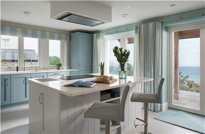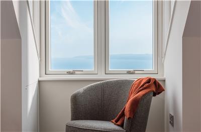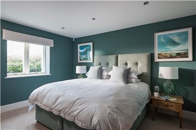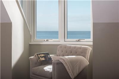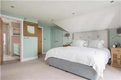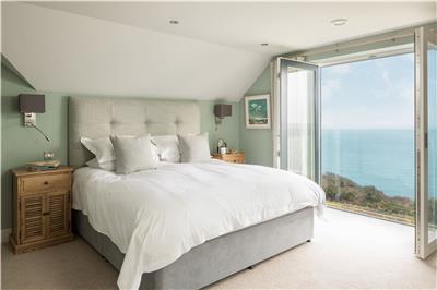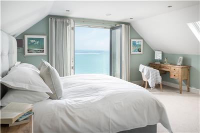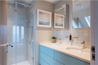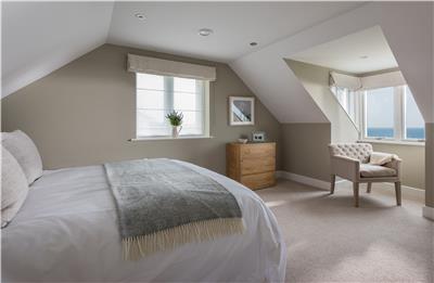 Upstairs, the stunning master suite enjoys uninterrupted sea views and a super king-size bed positioned to make the most of the outlook. Open the bi-fold doors on warm summer nights and let the gentle sea breeze lull you to sleep. The en-suite bathroom features a walk-in shower and twin vanity units.