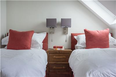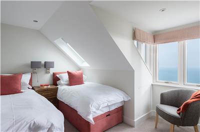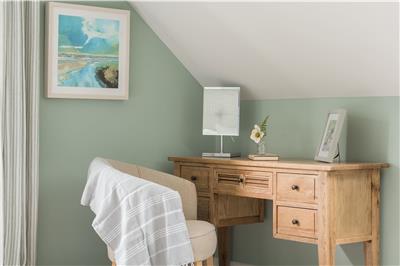 On the ground floor, the fourth bedroom offers flexible zip-and-link beds, ideal as either twins or a double. Decorated in deep, calming blues, it provides a peaceful retreat after a day exploring the coast.