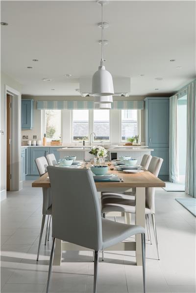 Adjacent to the kitchen, the dining area centres around a large oak table seating eight, set beneath elegant pendant lighting that creates a warm and intimate atmosphere long after dusk.
