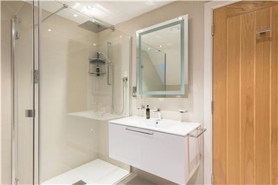 The home offers a sleek en-suite shower room to the master bedroom, a family bathroom with bath and shower, and an additional ground-floor shower room. Each features underfloor heating and heated towel rails for year-round comfort.