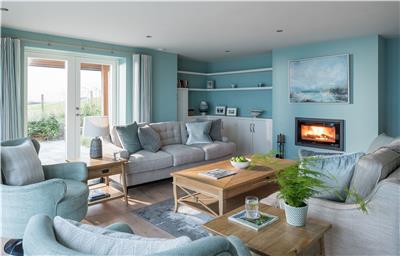 The heart of the home is the spectacular open-plan living space, bathed in natural light and opening directly onto the sun-soaked terrace. At one end, a stylish seating area invites you to unwind on two generous three-seater sofas and swivel chairs with matching pouffes, perfectly positioned to take in the view. On cooler days, the wood-burning stove adds a cosy touch, while a Smart TV offers relaxed evenings in.
